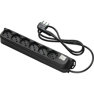 In materiale termoplastico. Prese bipasso Schuko 2P+T 16A, 1 spina a squadra 2P+T 16A. Sezione cavo N°/Mmq. 3x1. In sacchetto appendibile.