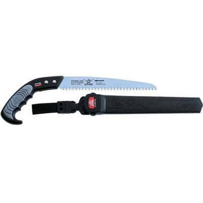 Lama in acciaio cromato, rettificata concava per limitare l'attrito. Denti passo Mm. 4, con triplice affilatura e temprati ad impulsi. Manico a pistola ergonomico. Completo di fondina. Ideale per il taglio sotto sotto l'altezza della spalla.